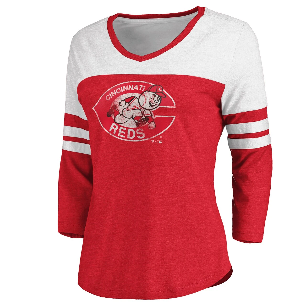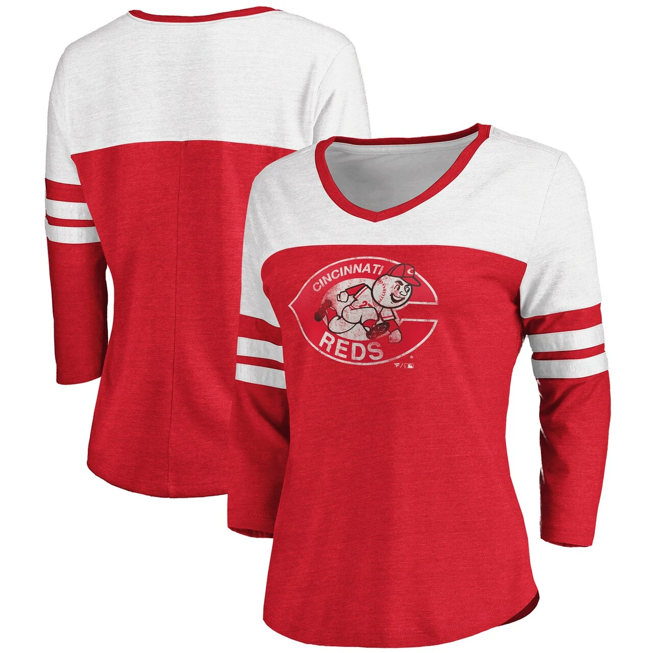 Women’s Cincinnati Reds Fanatics Branded Heathered Red/White Women’s Two-Toned Distressed Cooperstown Collection Tri-Blend 3/4-Sleeve V-Neck T-Shirt