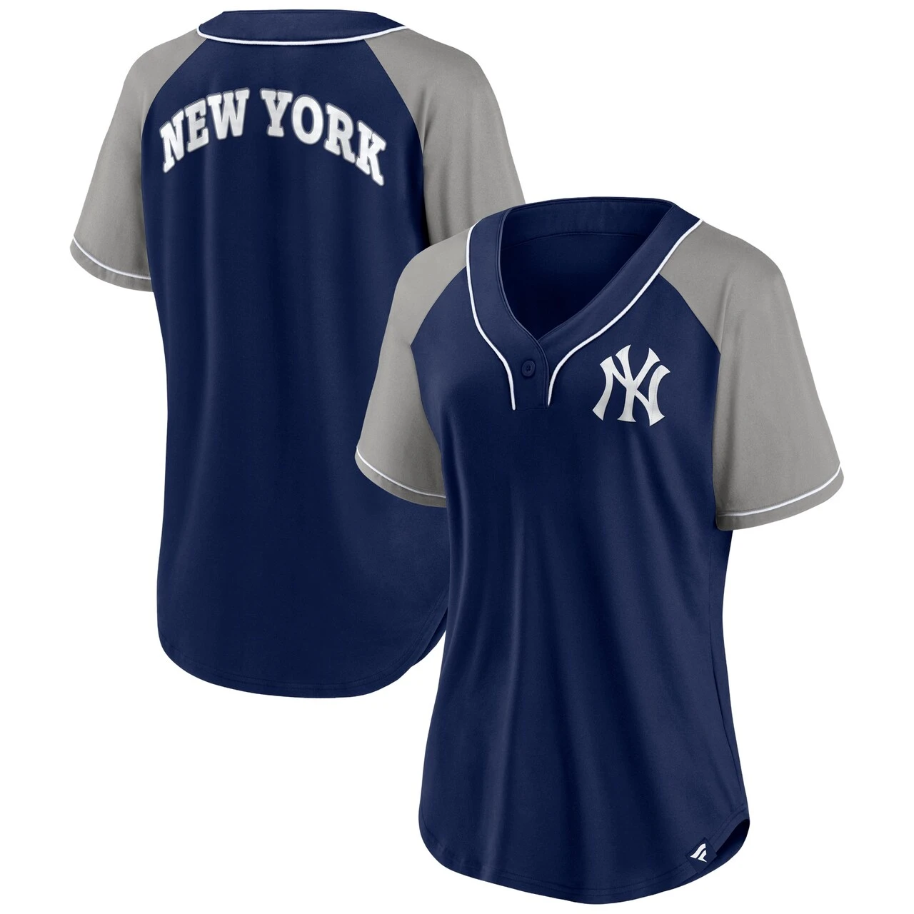 Create a fashionable New York Yankees look with this Ultimate Style T-shirt from Fanatics Branded. Its two-tone design features a chic V-neckline and sparkly New York Yankees graphics. The rounded hem and sporty raglan sleeves also help provide a more comfortable, flexible fit.
